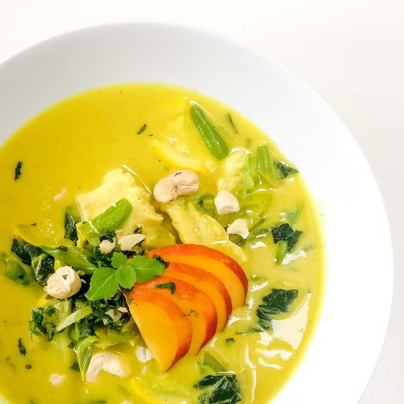 The key to this soup lies in its rich broth. Fresh ginger, garlic, onions, and squash are sautéed in fragrant oil before being simmered with curry, turmeric, and kaffir lime leaves. These ingredients infuse the coconut milk and broth with warmth and depth. The addition of lemon oil and apple cider vinegar adds a gentle acidity that balances the creamy sweetness of the coconut milk. After simmering for 25 minutes, the broth becomes velvety and full of flavor, ready to complement the delicate fish.